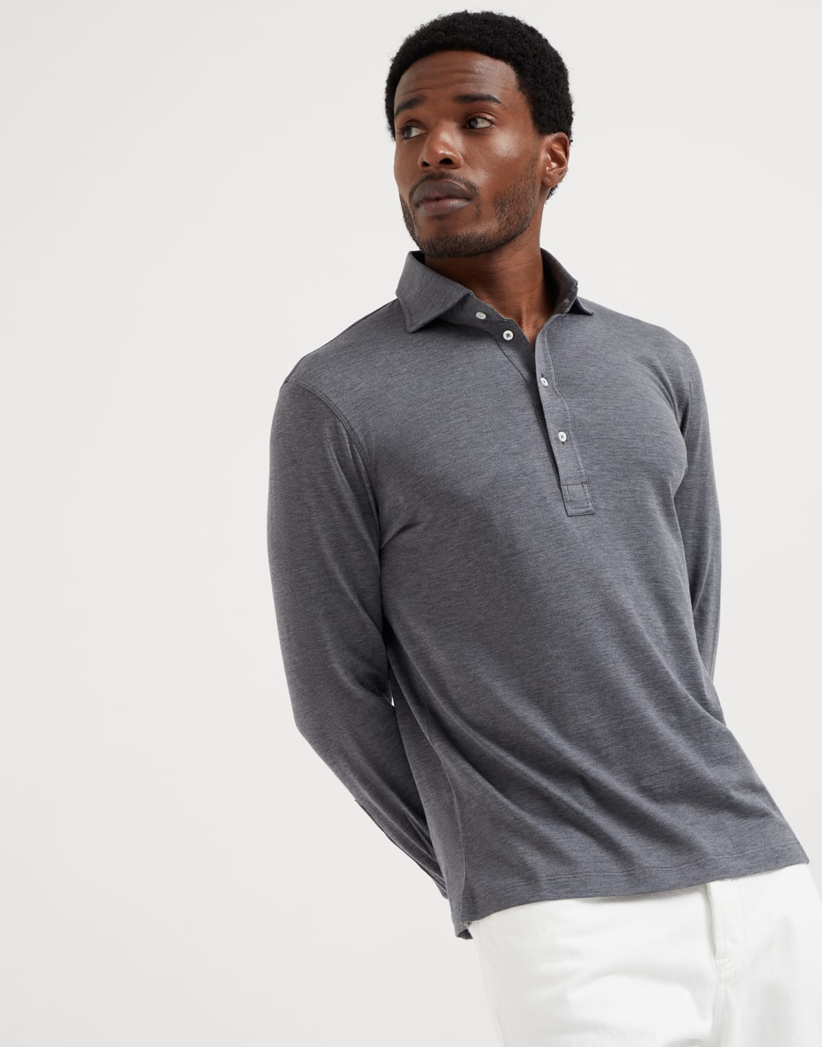 Silk and cotton lightweight jersey long sleeve polo with shirt-style collar